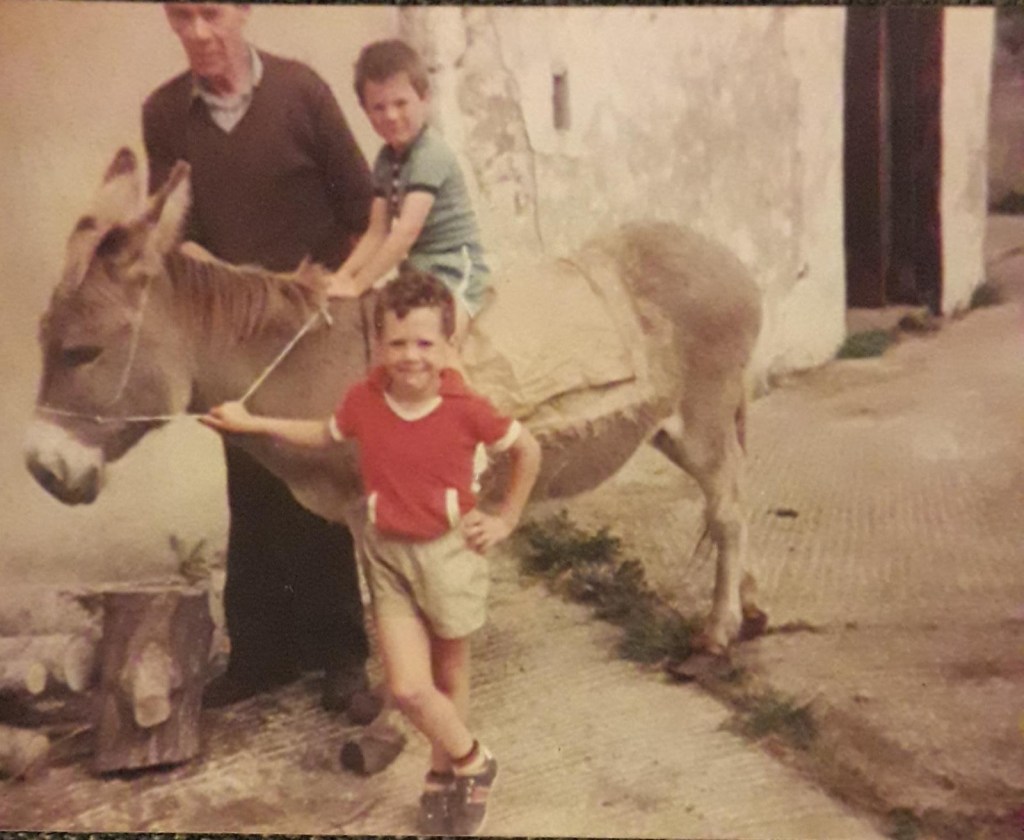 Little Michael Brosnan is in the photo above wearing the red shirt and looking quite confident next to the donkey.